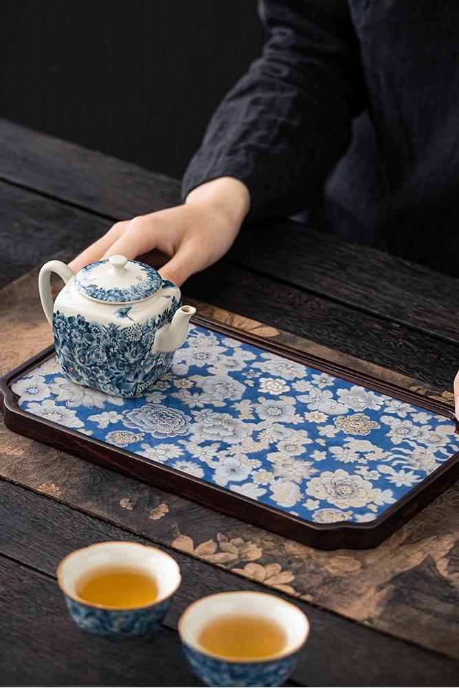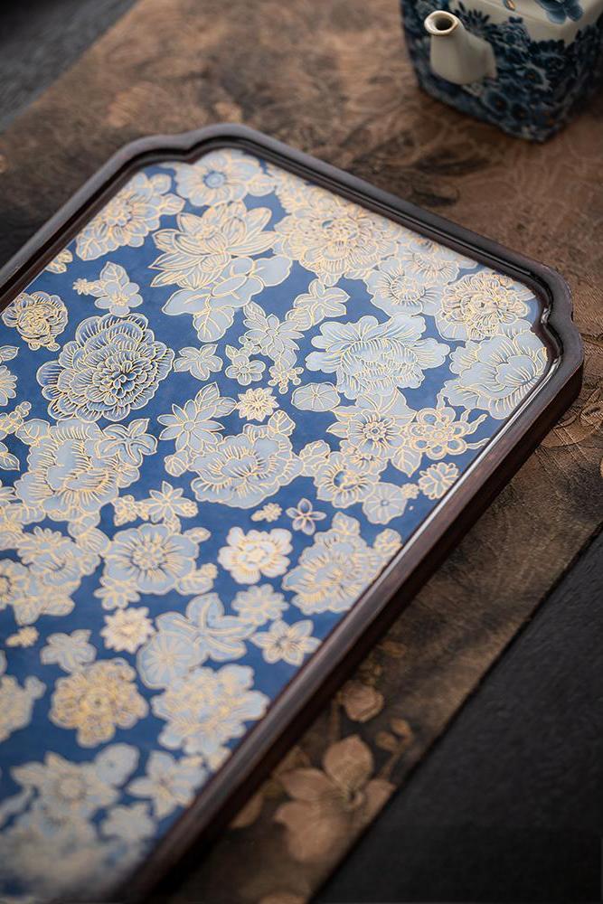 Chinese design at its finest: a wooden serving tray with a delicate blue floral ceramic inlay for functional elegance.