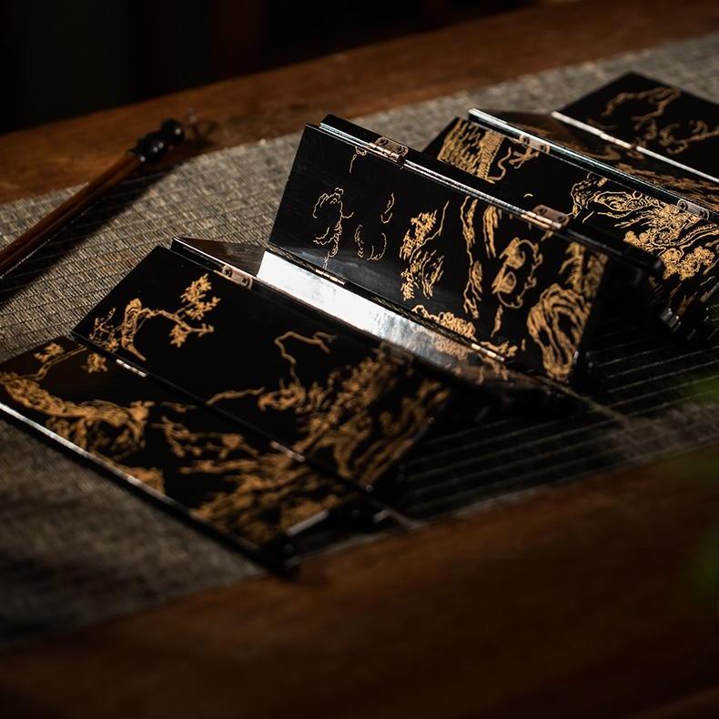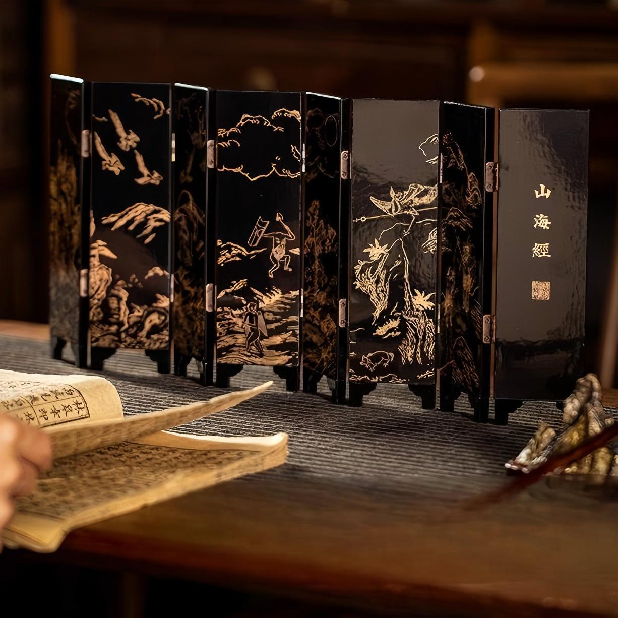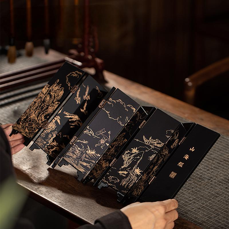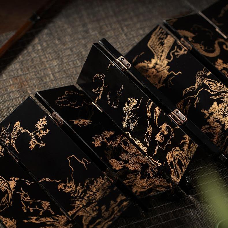 Introduce a piece of ancient Chinese mythology into your home with this exquisite mini folding screen inspired by the legendary Shanhai Jing (Classic of Mountains and Seas). Featuring intricate black and gold engravings of mythical beasts, ancient landscapes, and folklore scenes on its double sides, this decorative folding screen offers both artistic beauty and cultural significance. Each panel is delicately crafted, bringing to life the fascinating world of ancient Chinese mythology.